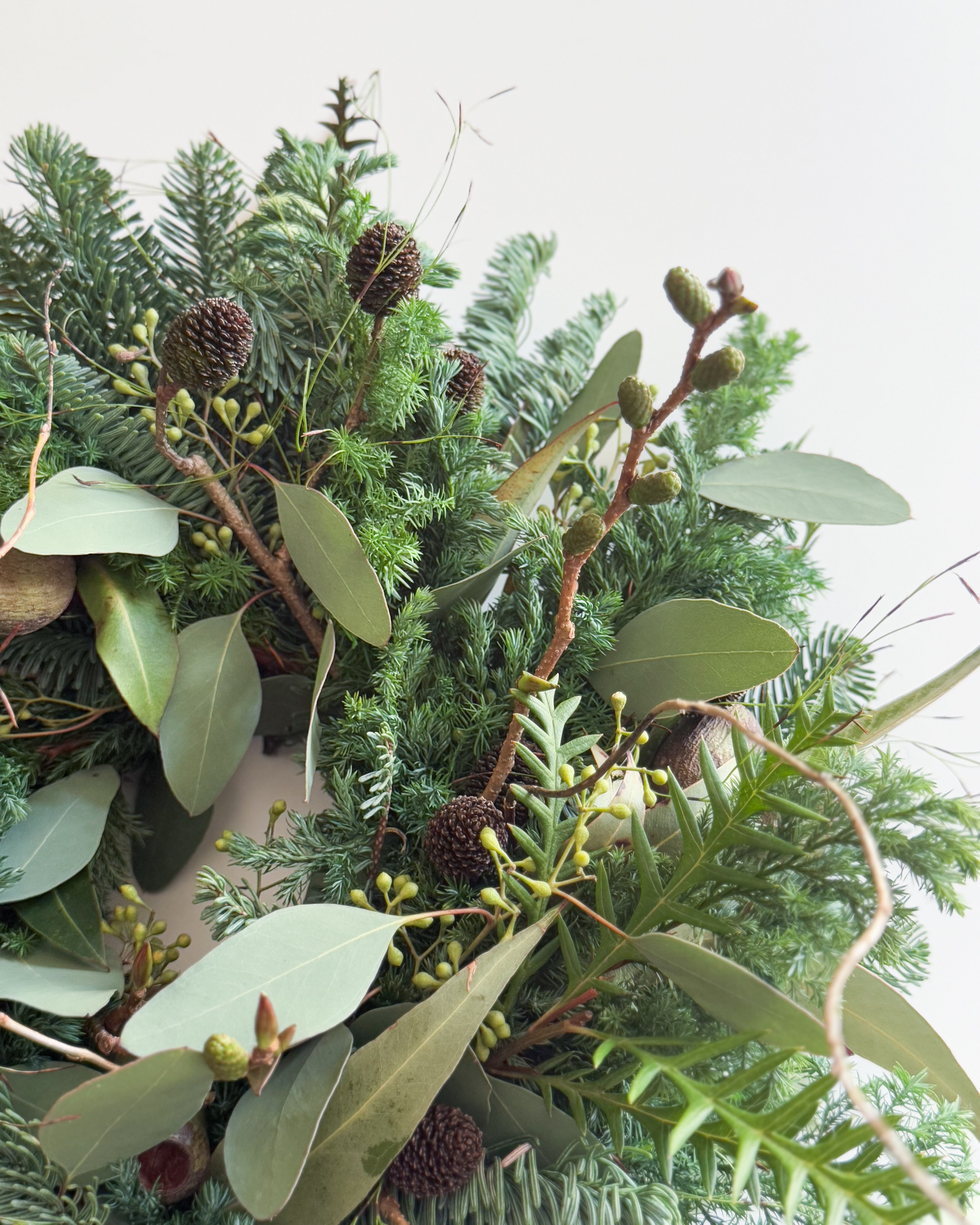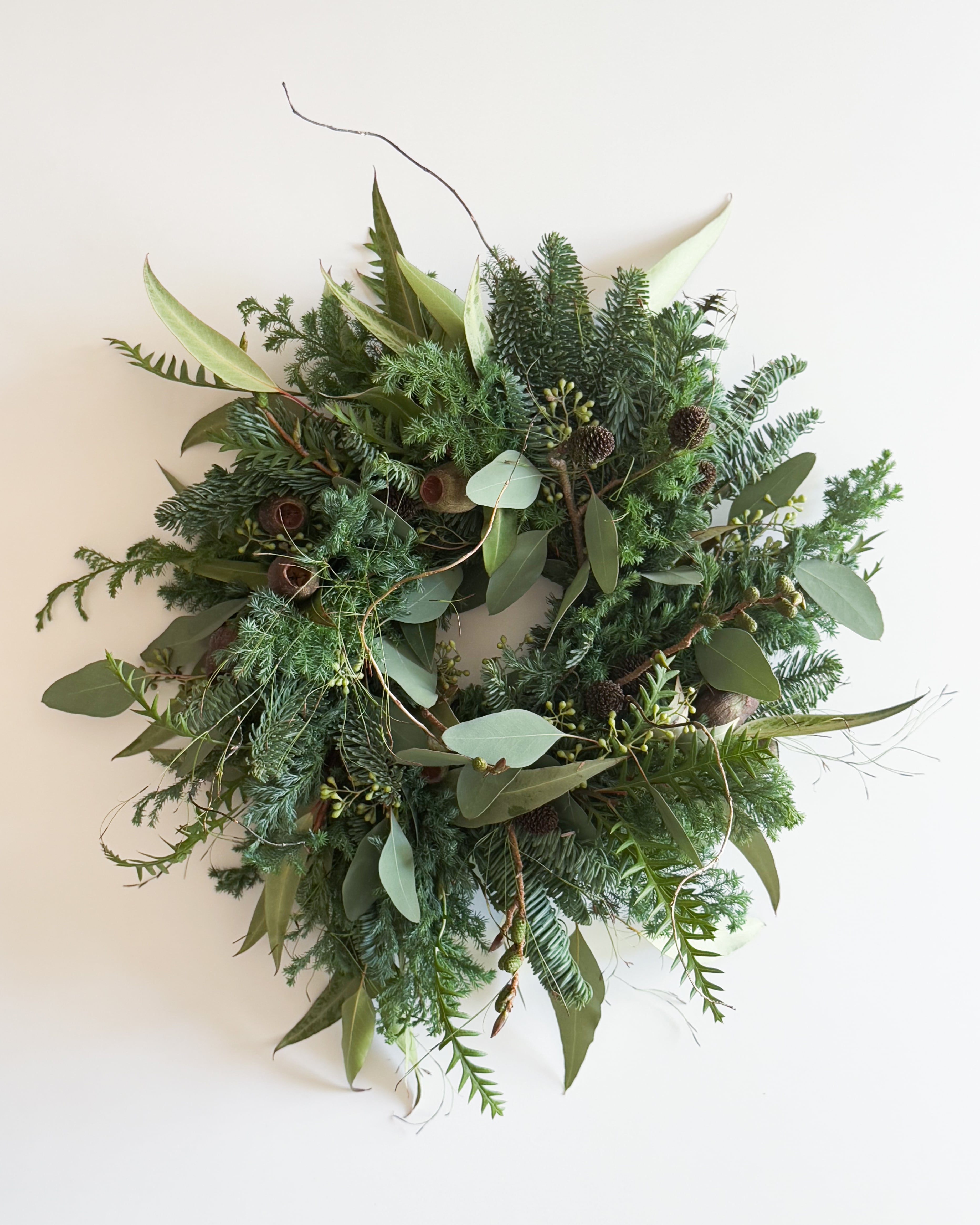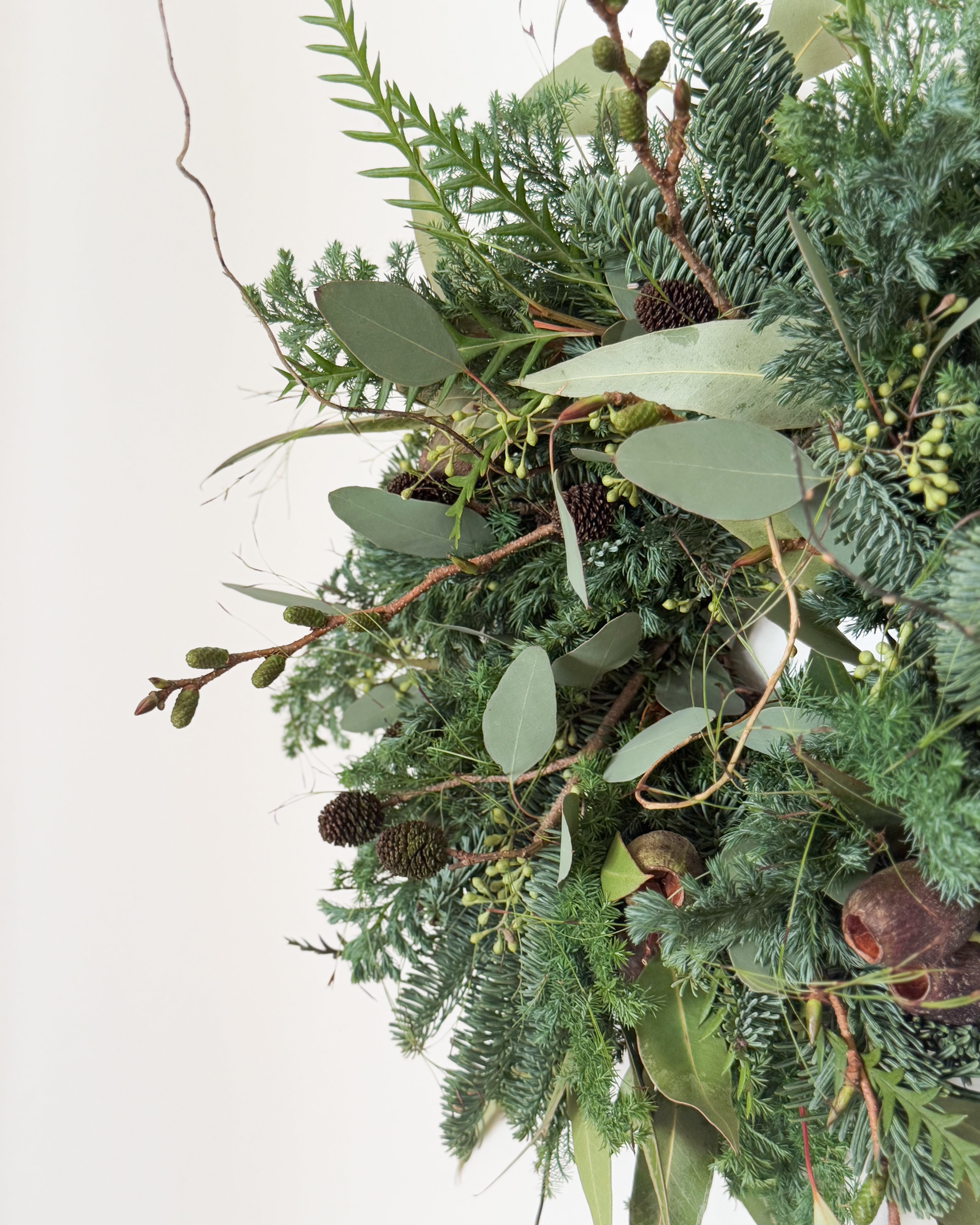 オレゴン産のモミ、ユーカリなどを贅沢に使用し、ワイルドなリースを作成しました。