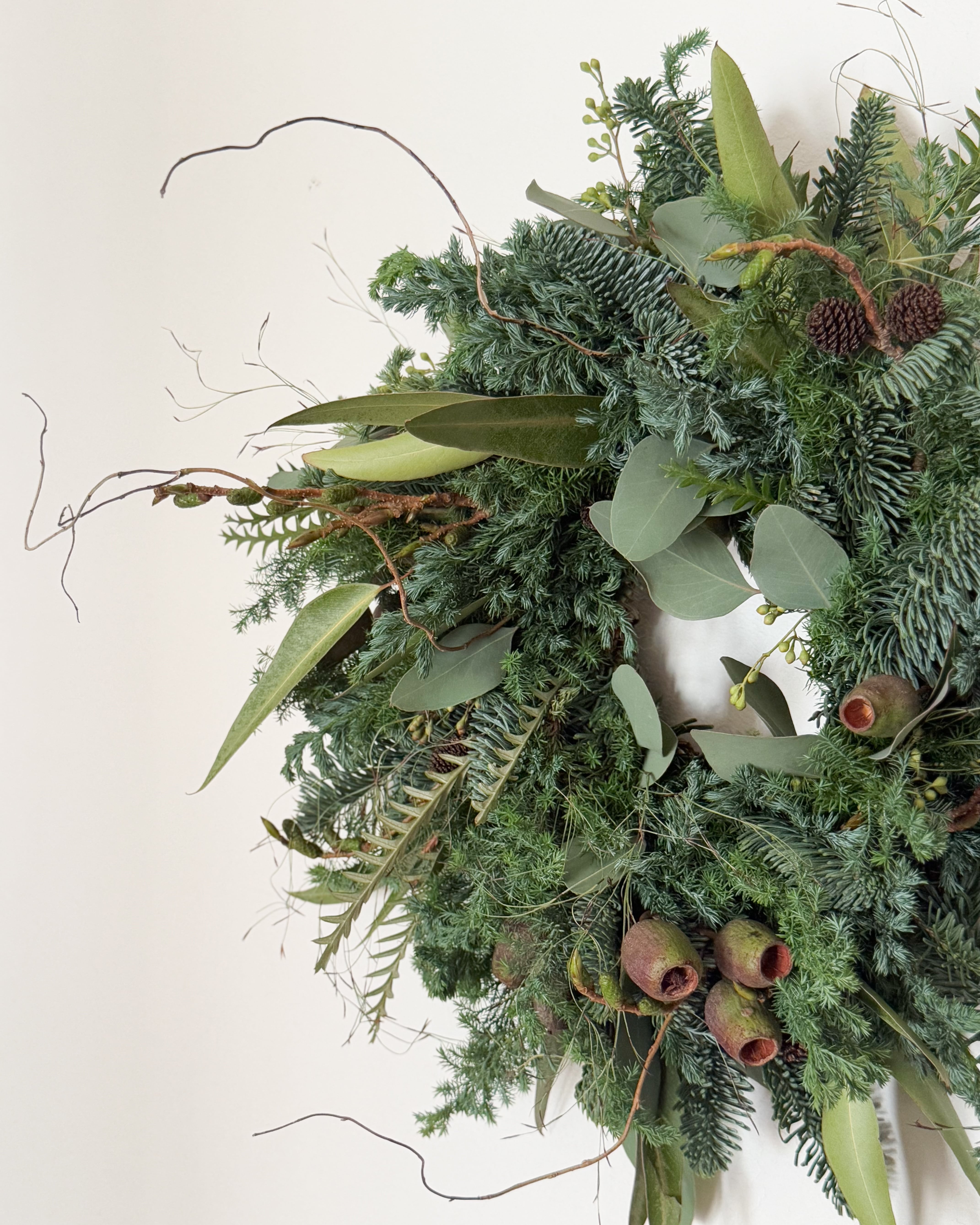 オレゴン産のモミ、ユーカリなどを贅沢に使用し、ワイルドなリースを作成しました。