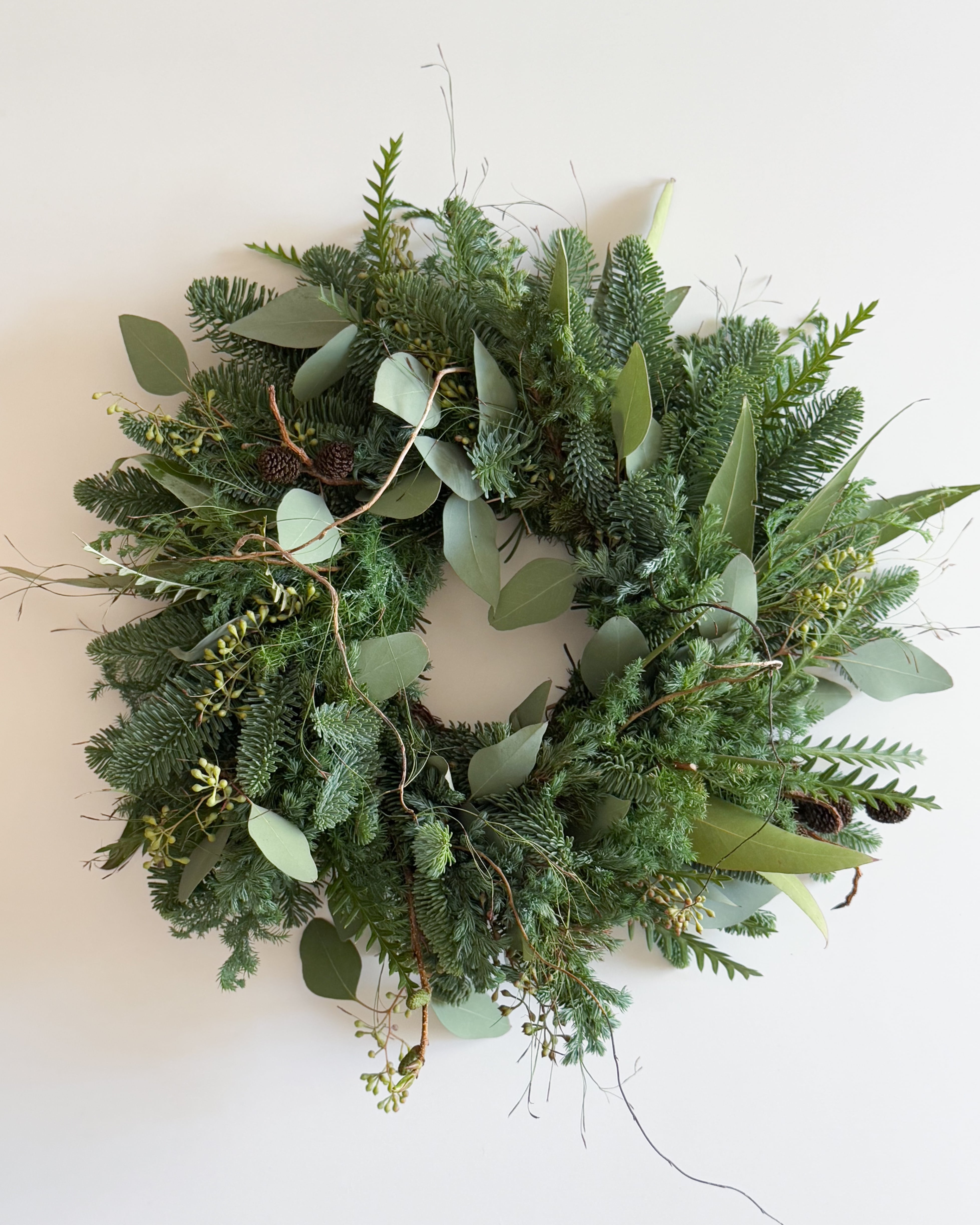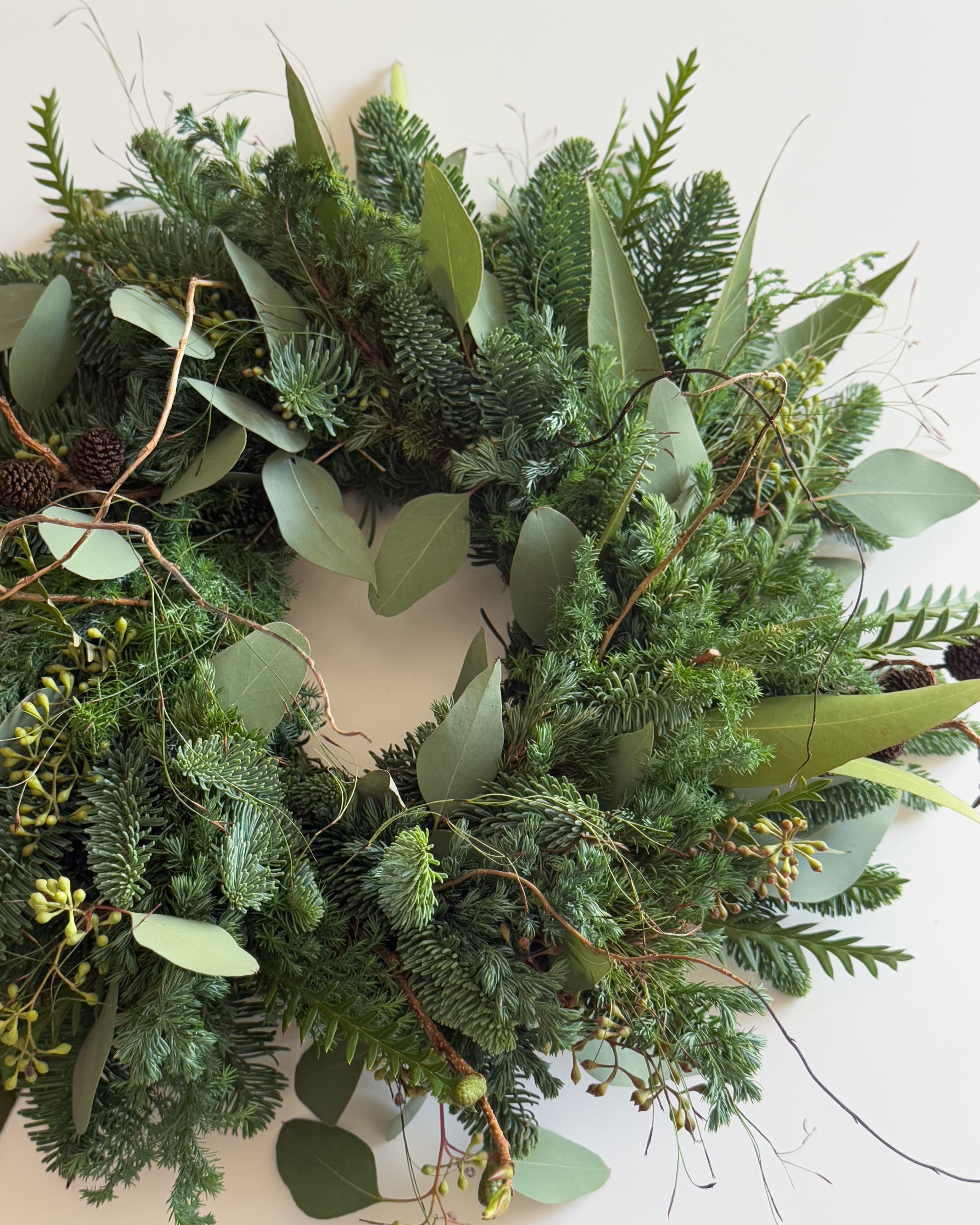オレゴン産のモミ、ユーカリなどを贅沢に使用し、ワイルドなリースを作成しました。